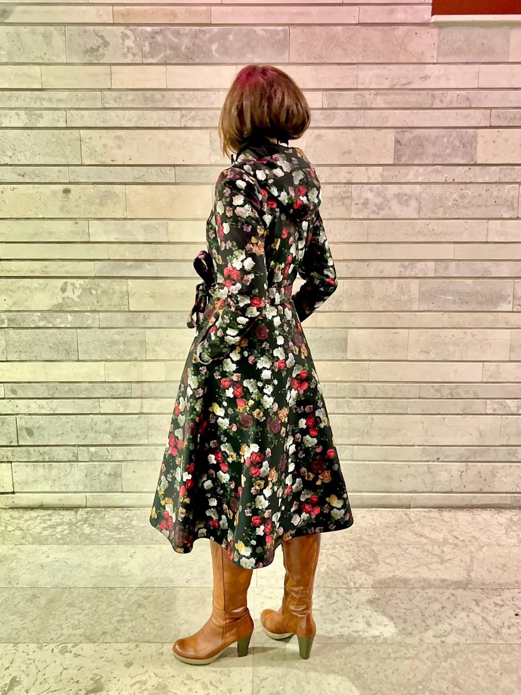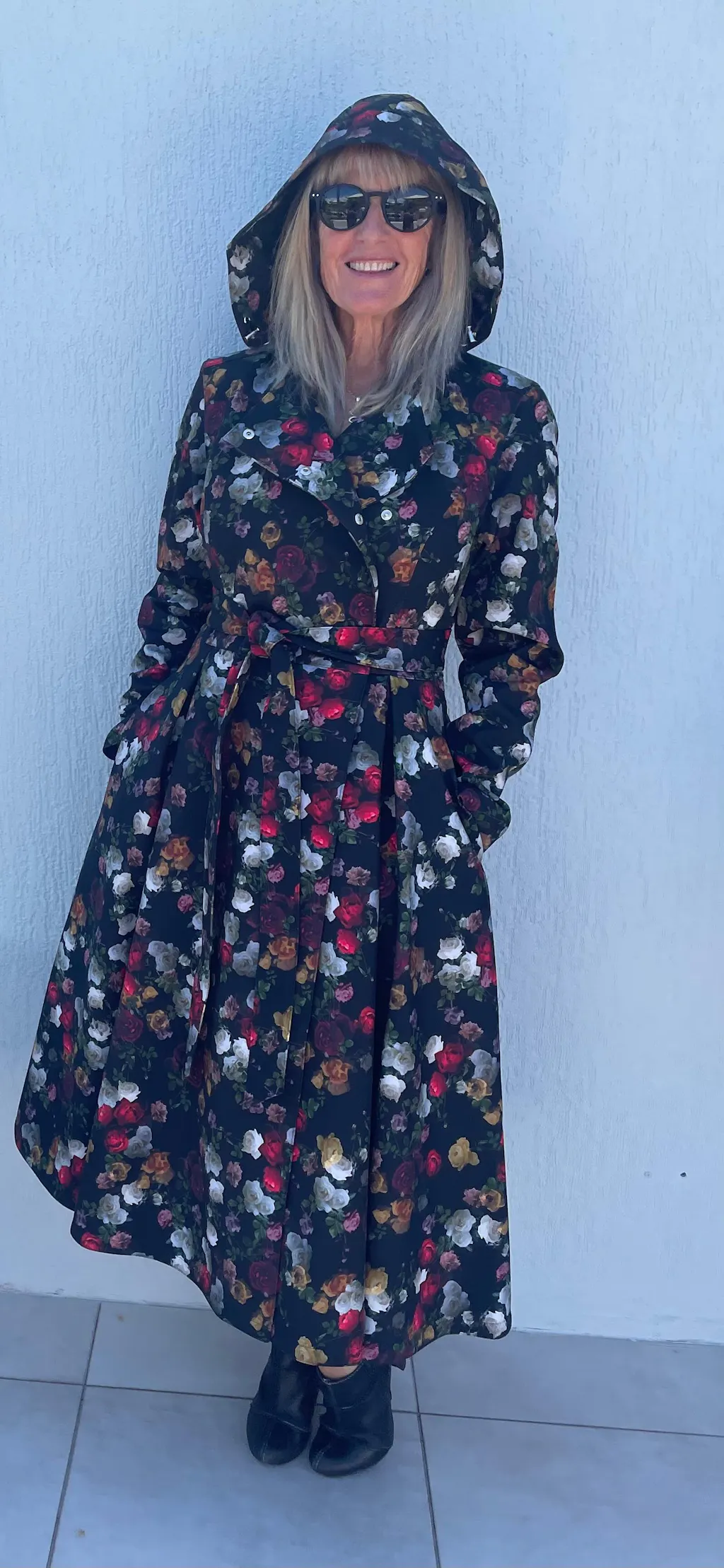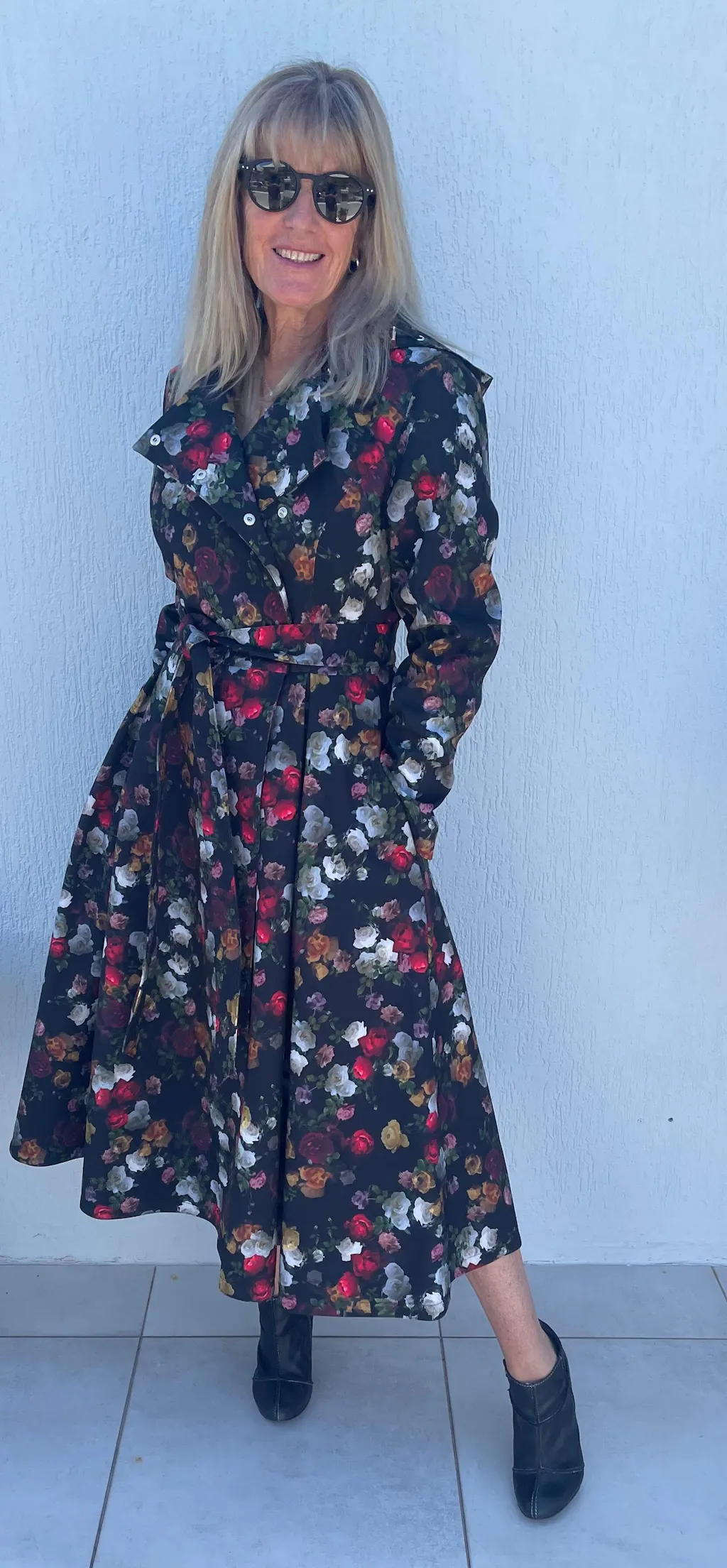 A women’s black double-breasted floral trench coat with vibrant vintage rose print, finished with luxurious black Italian satin lining and a matching tie belt for a classic, elegant silhouette.