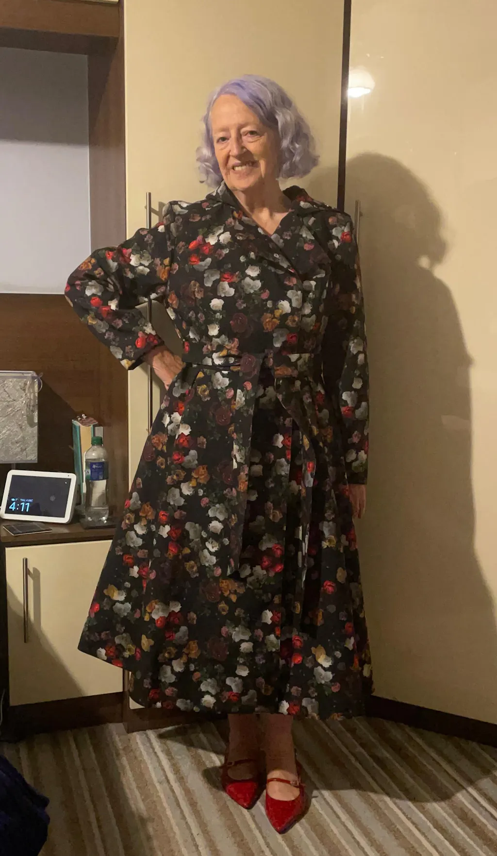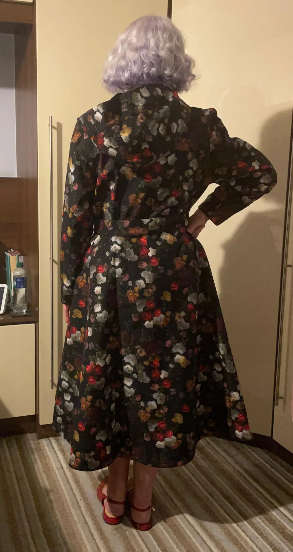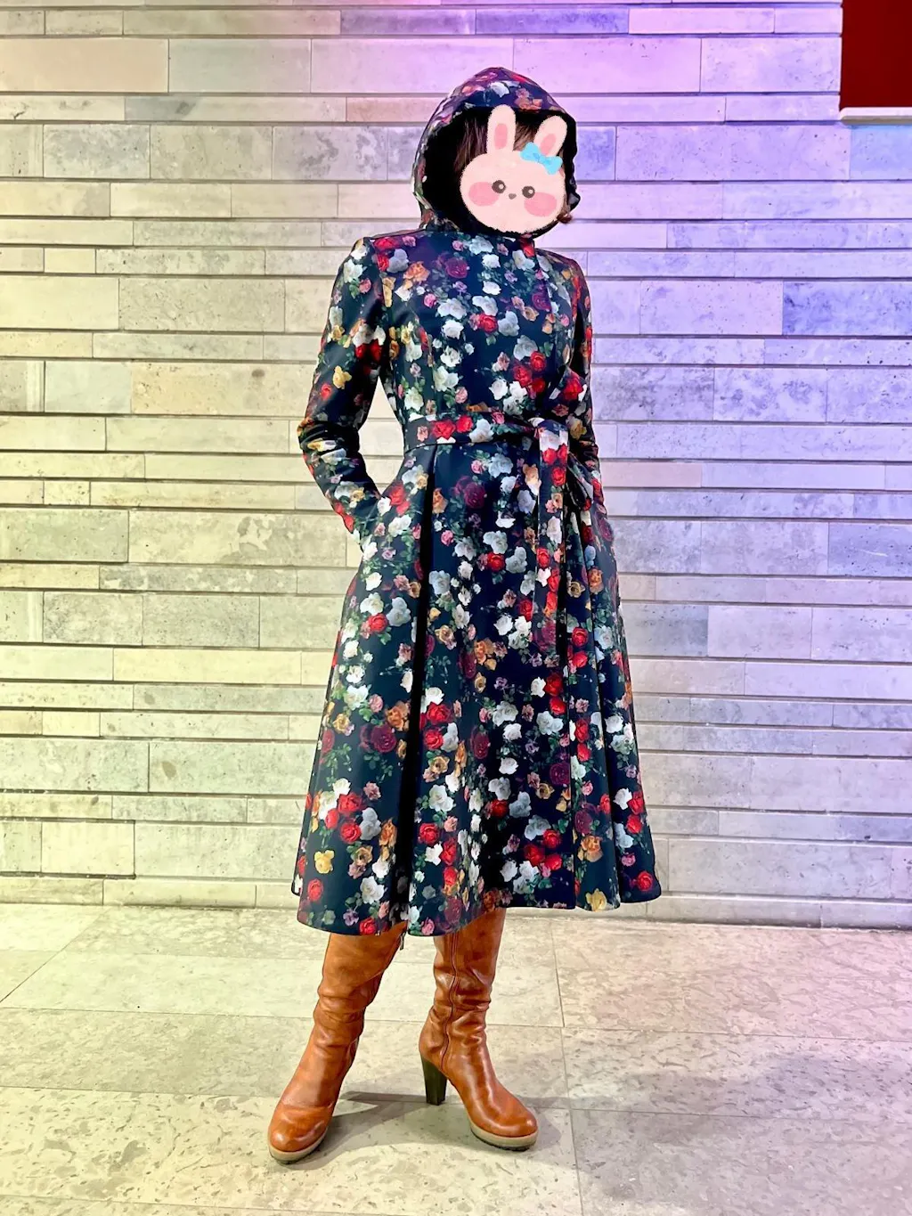 A women’s black double-breasted floral trench coat with vibrant vintage rose print, finished with luxurious black Italian satin lining and a matching tie belt for a classic, elegant silhouette.