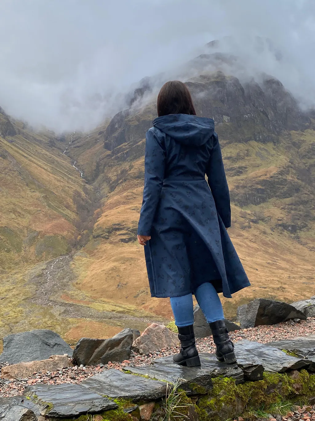 Double Breasted Trench Coat in Dark Blue with Black Floral Print | Blue Frost