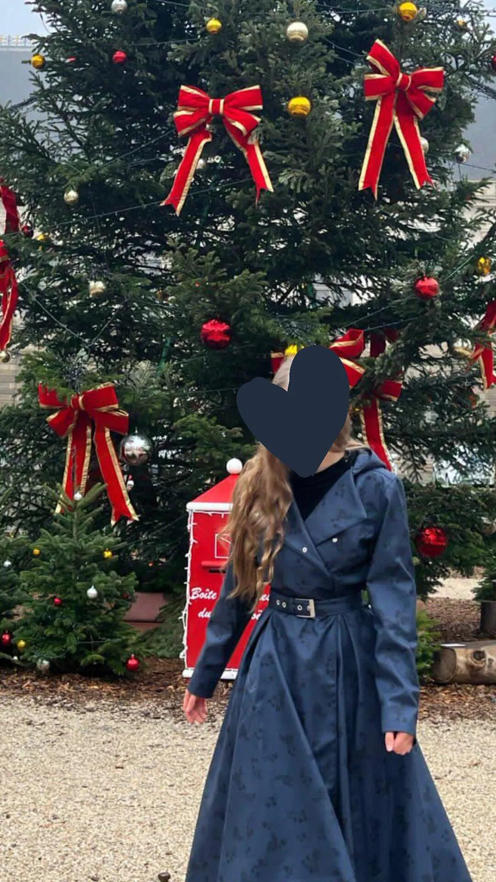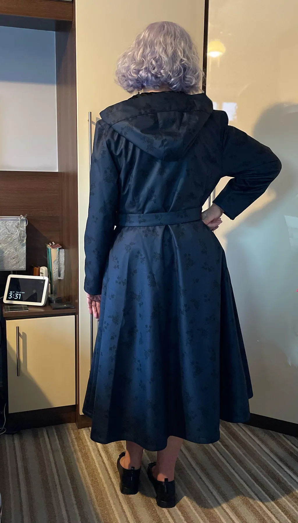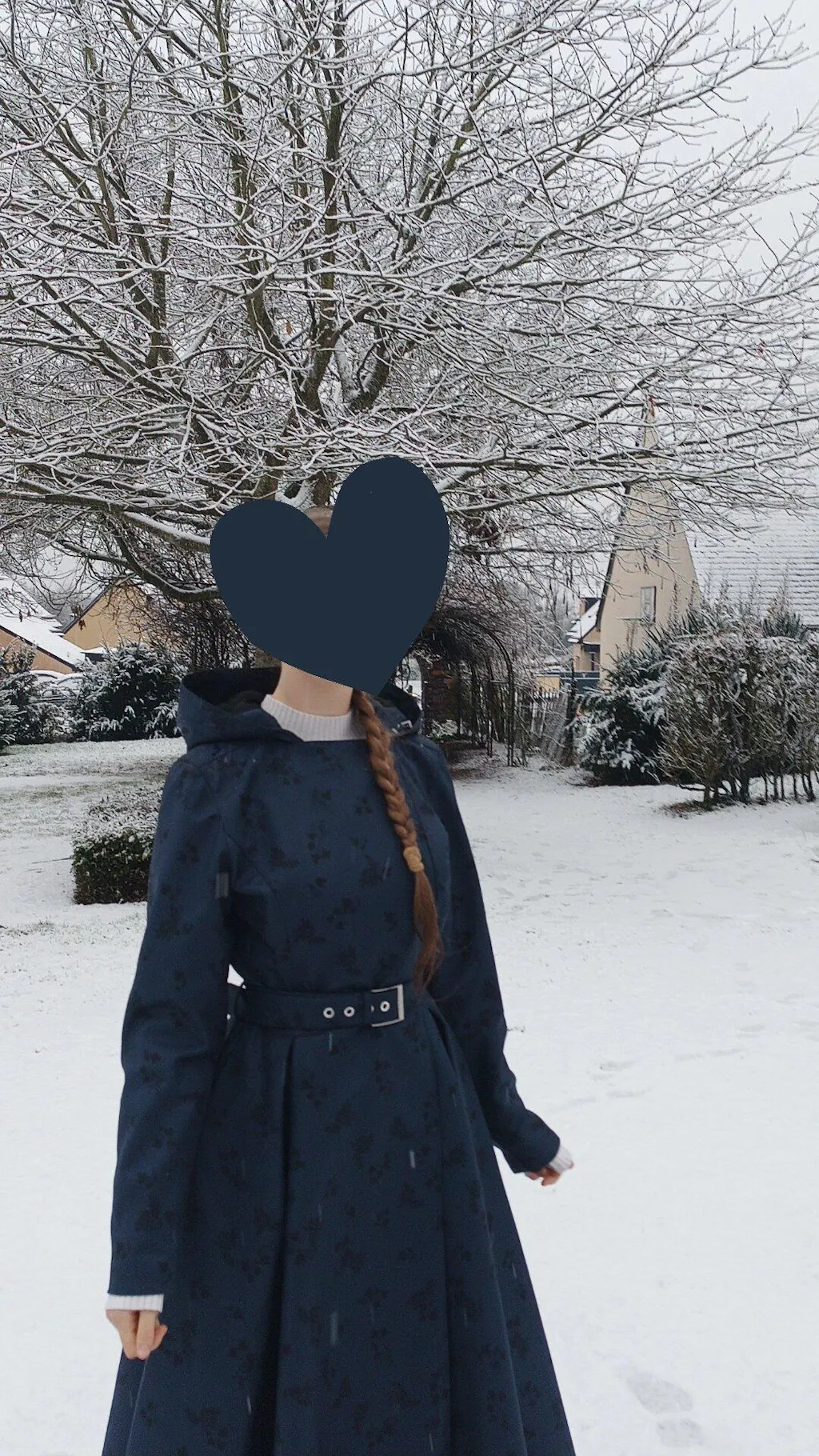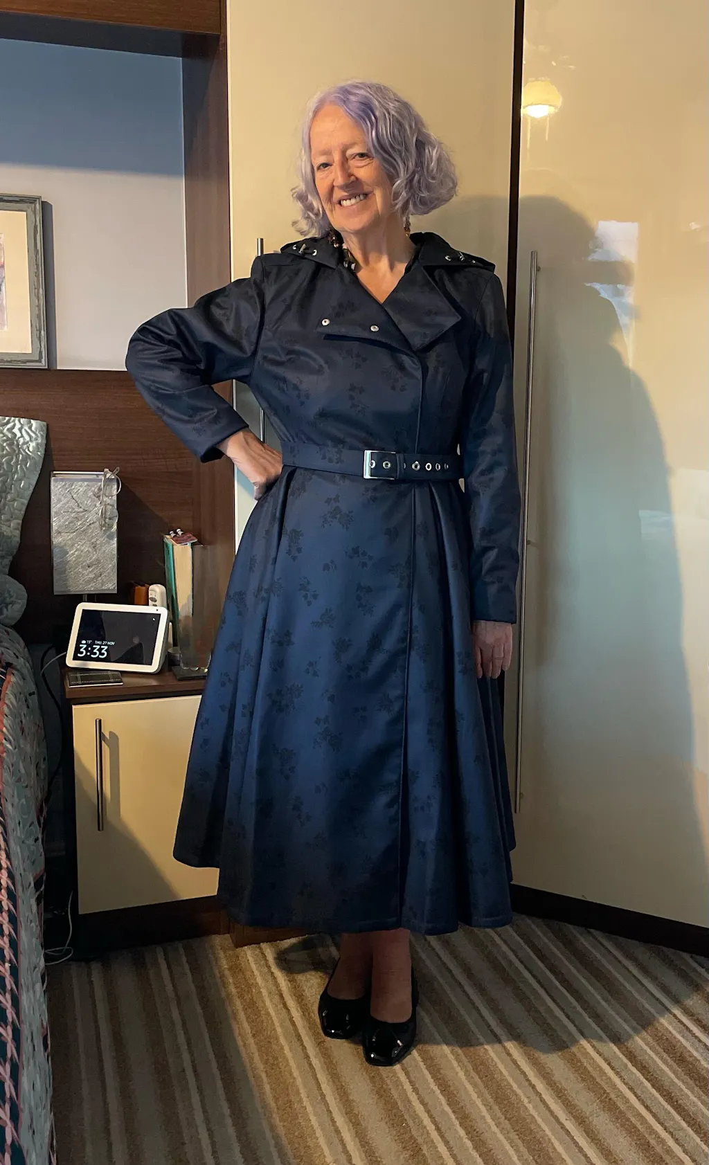 A women’s deep navy blue double-breasted floral coat with elegant black satin lining and a matching belt, offering a romantic, timeless silhouette that stands out in any weather.