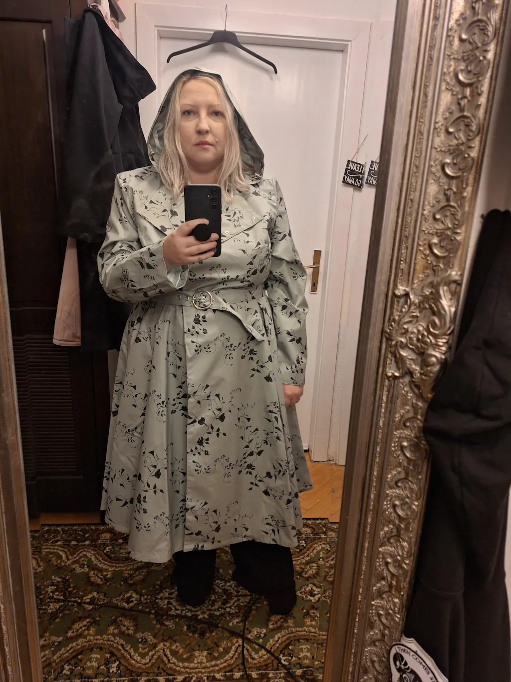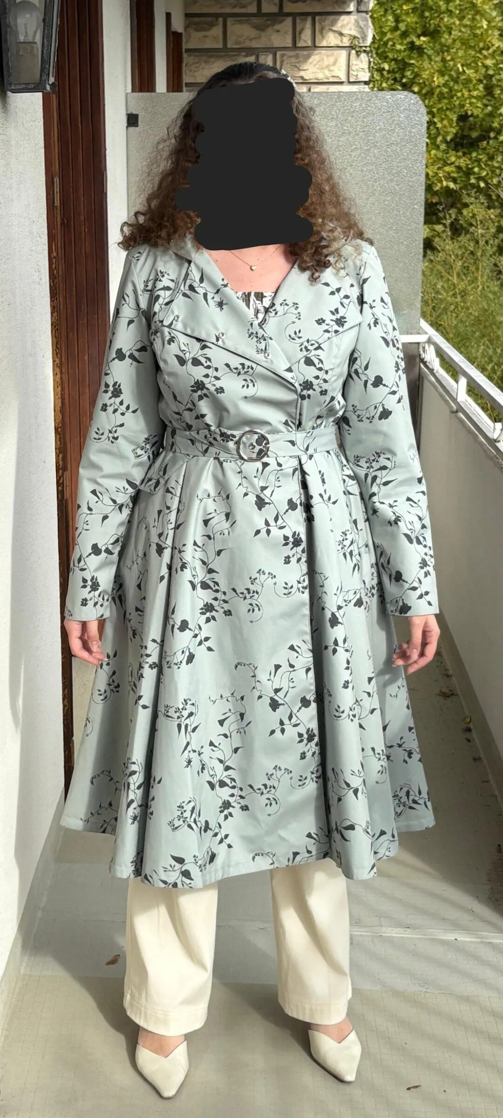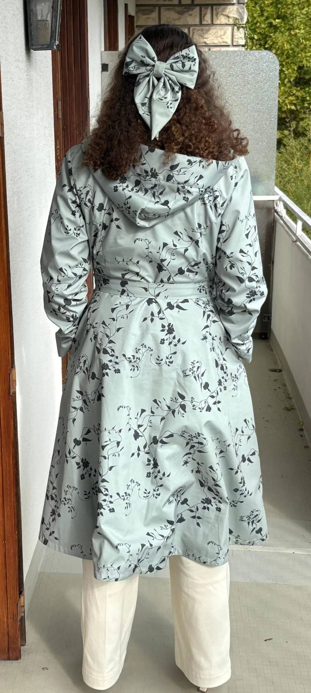A women’s double-breasted water-resistant trench coat in a refreshing pastel mint green with a dark green floral print, finished with a matching belt and a full Italian satin lining in light mint green for an elegant look.