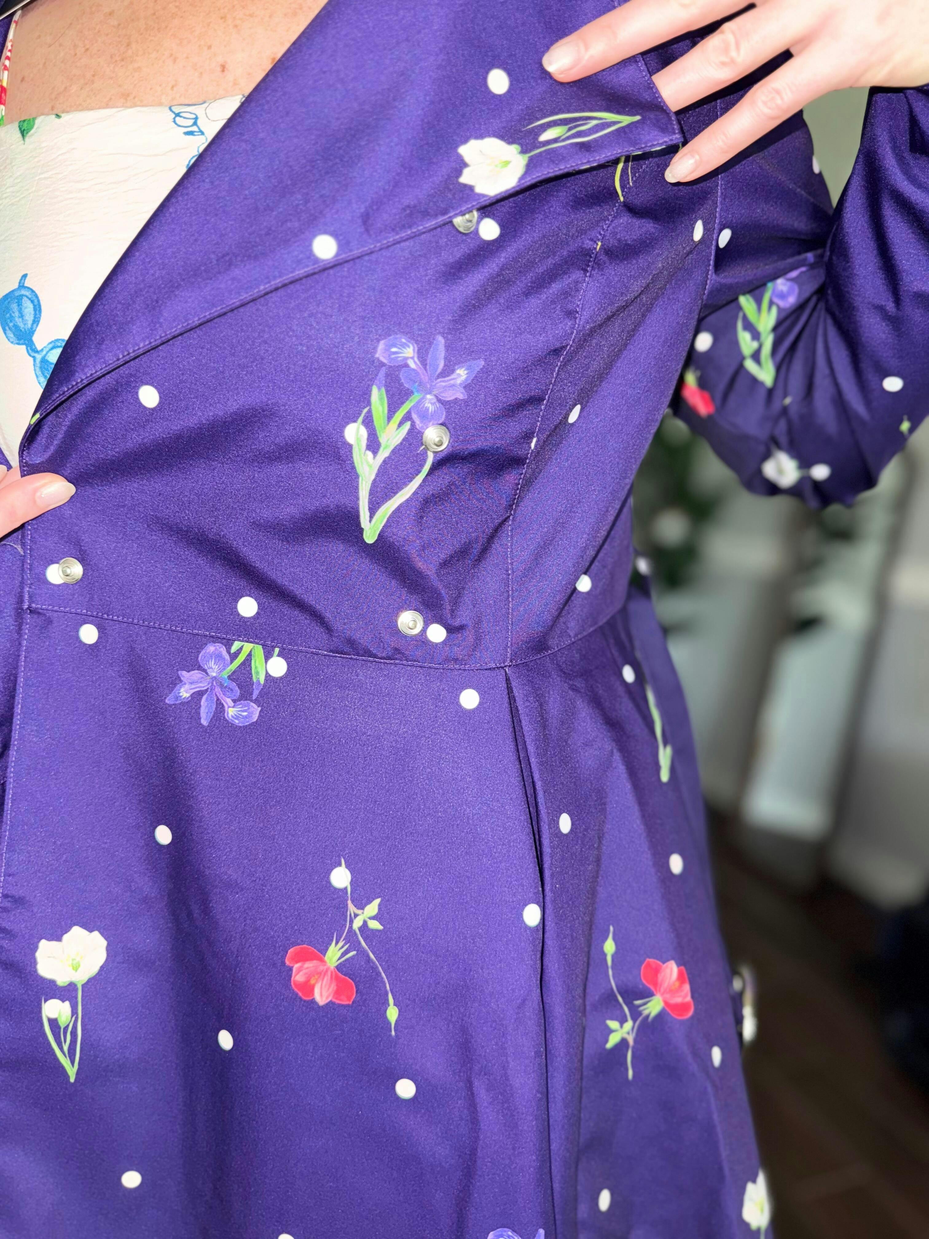 This violet trench coat features vibrant yellow, red, white, and violet flowers, with delicate white polka dots lightly scattered across the fabric. Its double-breasted style adds a classic touch of elegance, while the adjustable hood allows for a customizable fit. Made from lightweight shell fabric and lined with soft ashy pink Italian satin, this coat combines practicality with a dreamy, garden-inspired charm. Ideal for those who appreciate elegant design with a modern twist.