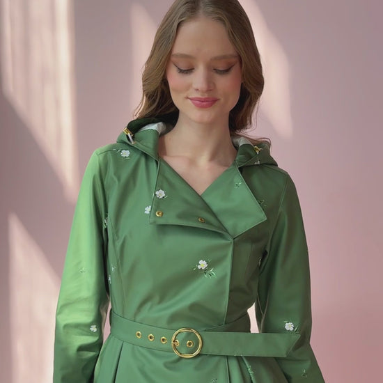 Double Breasted Trench Coat in Green with Flower Print | Primrose in Bloom