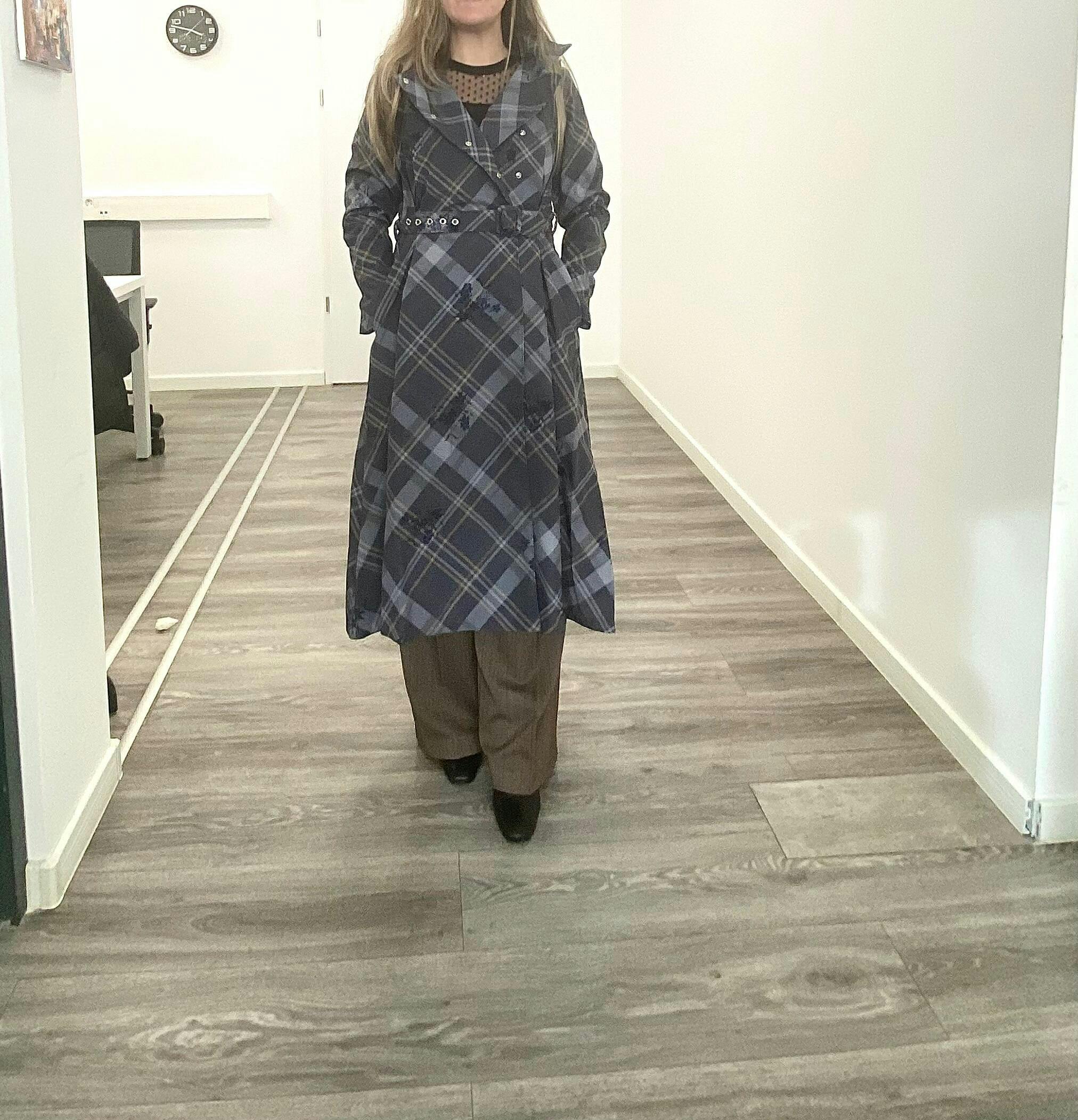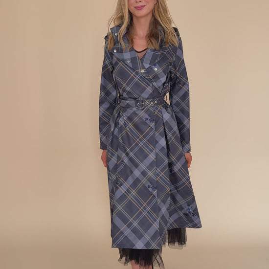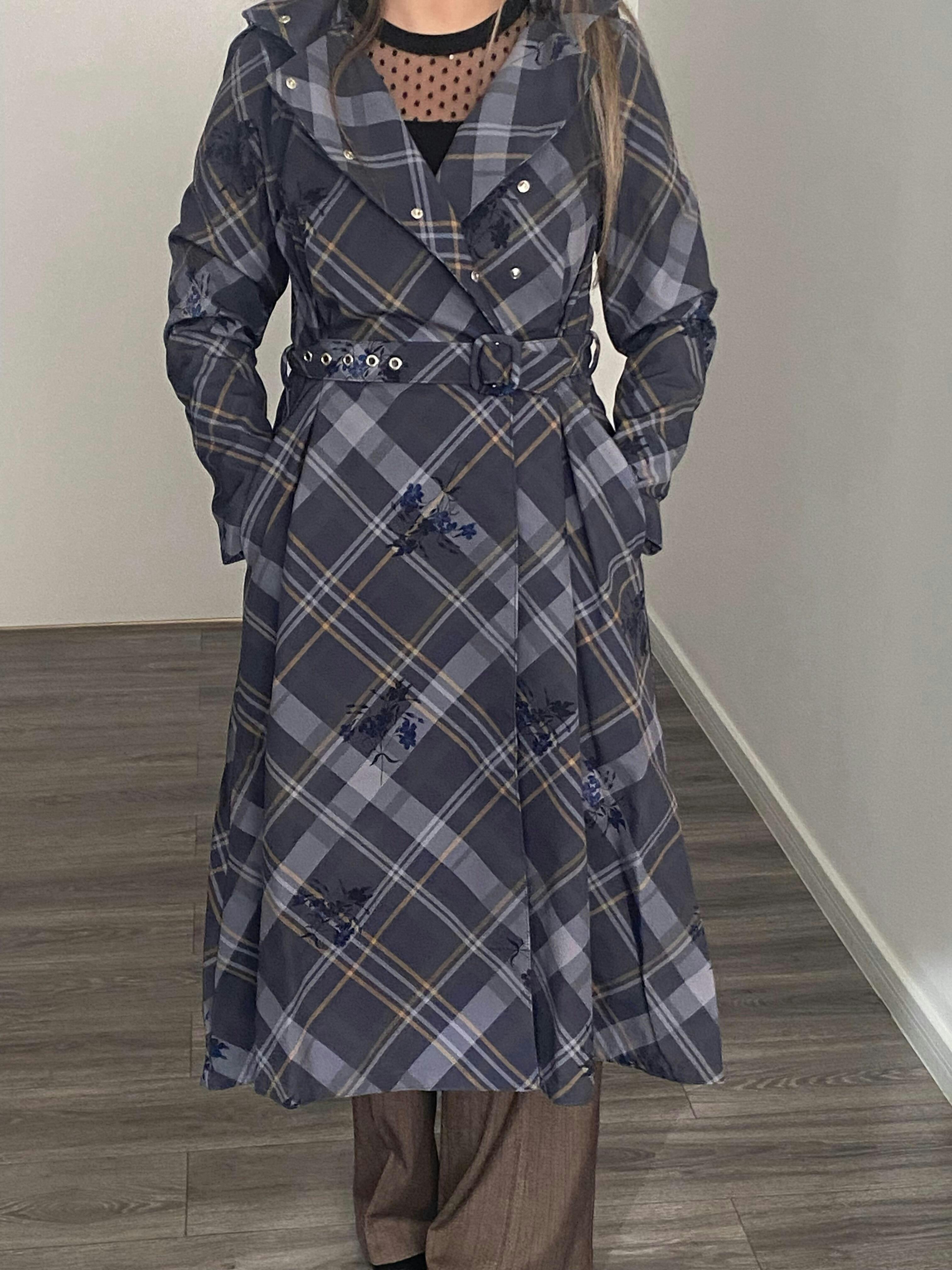 'Duchess in Blue' is a coat made for confidence and elegance. Its greyish-blue color feels calm and royal - a shade that quietly stands out in any setting. A plaid pattern and a small blue flowers that blend into the design, add a delicate and unique touch. The coat style has front pleats in the skirt, adding soft shape. The belted waist flatters your figure and brings balance to the coat’s structured look. It also comes with a detachable hood, giving you the freedom to adjust your style when the weather changes. It’s water-resistant and light enough for everyday wear - yet elegant enough for special moments. 'Duchess in Blue' coat is a piece you’ll feel proud to wear, season after season.