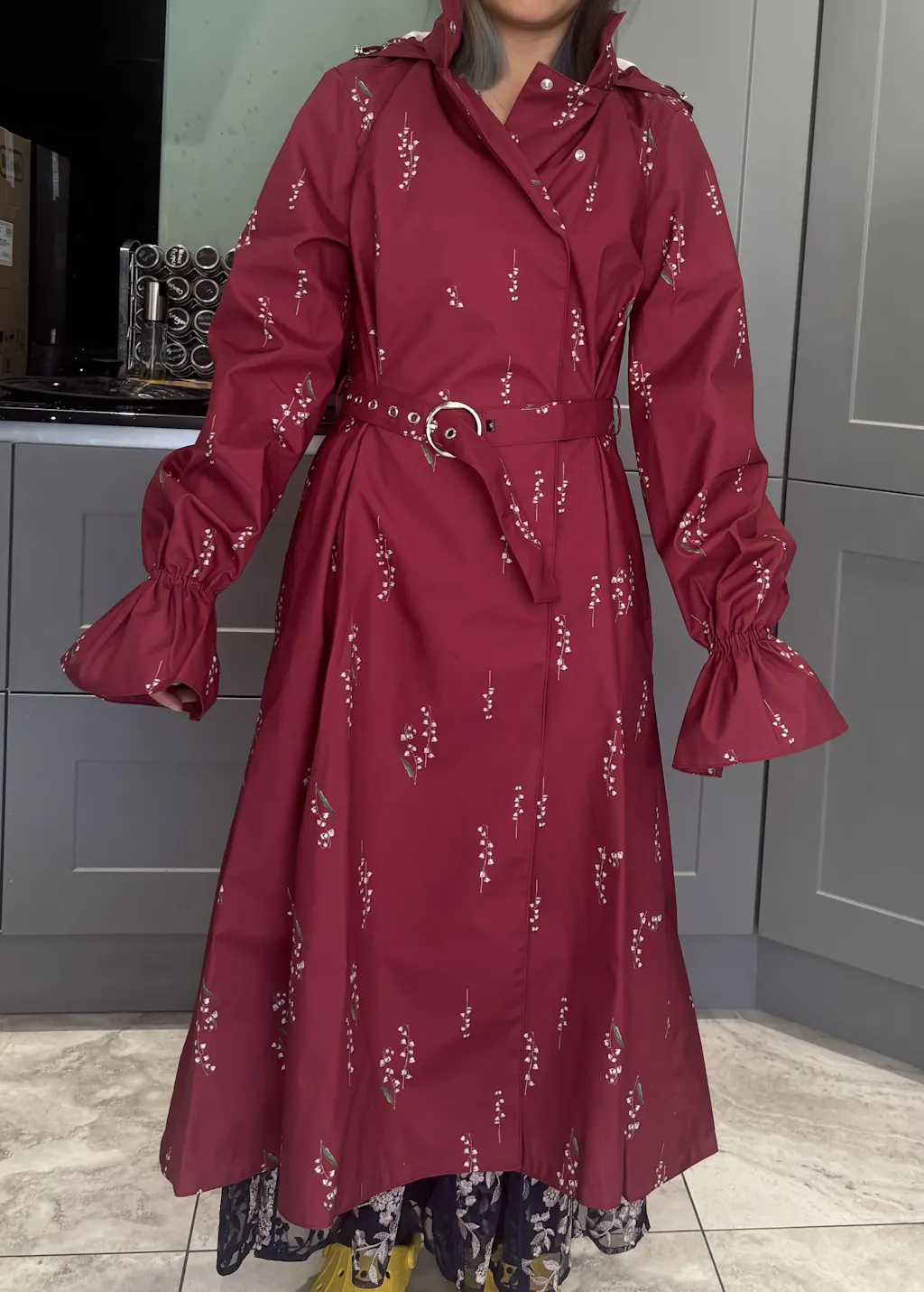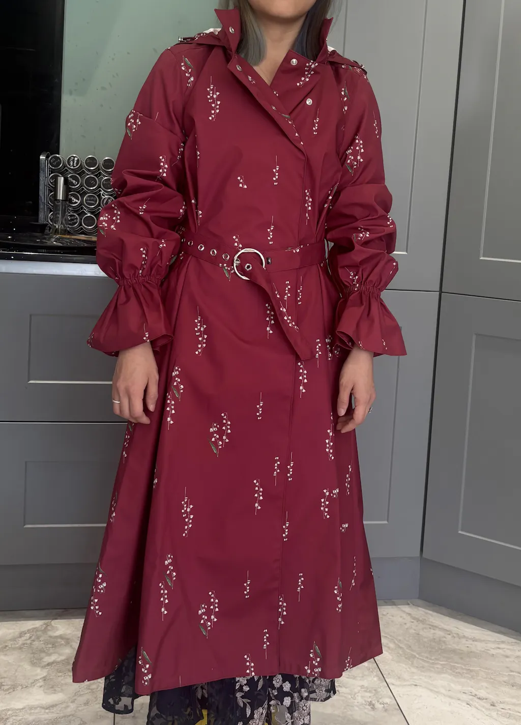 A women’s double-breasted burgundy trench coat with lily of the valley print, front pleats, soft pink Italian satin lining, and a matching belt. The slightly widened, gathered sleeves create a voluminous shape with elegant ruffles.
