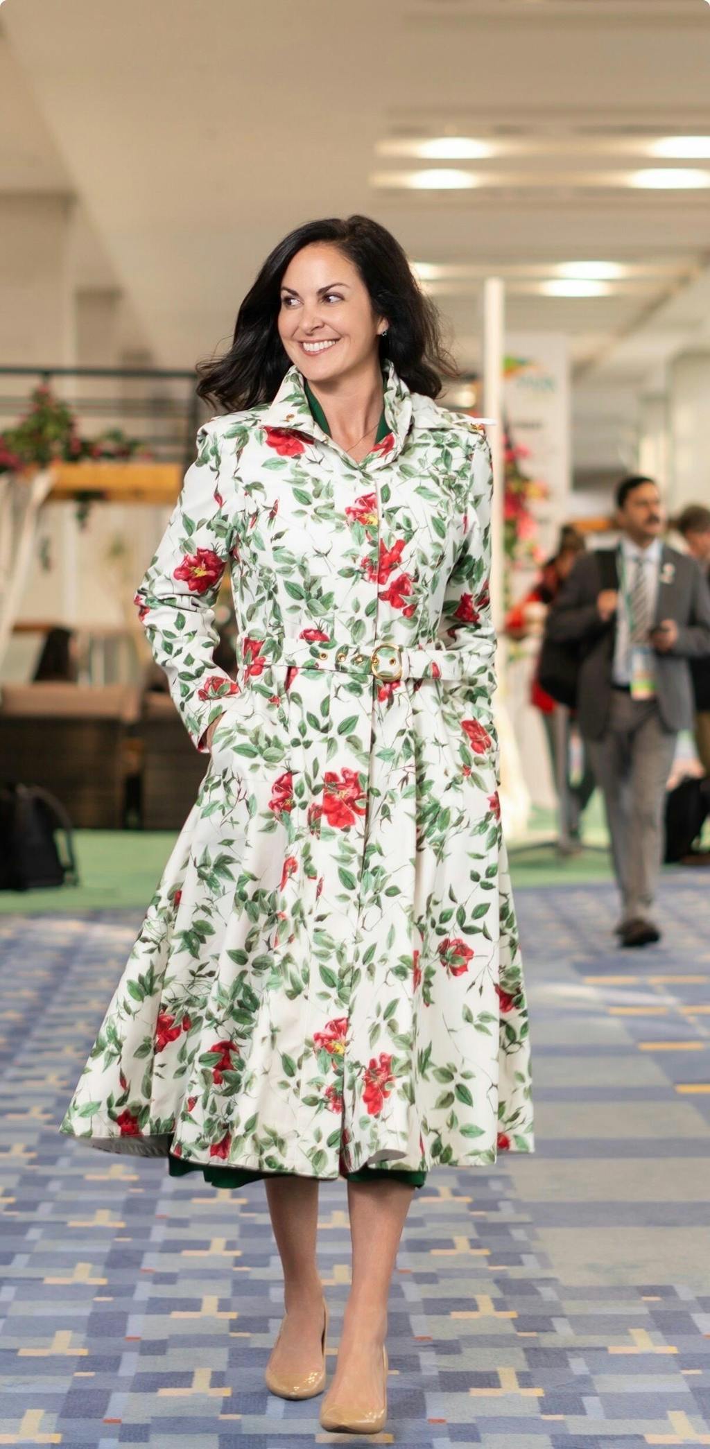 A women’s floral rose-print water-resistant coat with a fitted bodice and a flared A-line skirt. It is lined with smooth white Italian satin and comes with a matching belt with elegant gold-tone hardware for a romantic, beautifully defined silhouette.