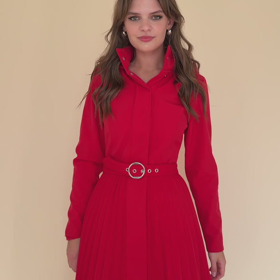 You deserve a coat as charming as a 'Scarlet Waltz' - full of grace, confidence, and timeless elegance. This coat is made to move with you through crisp mornings and gentle rains, keeping you stylish and comfortable on every step. Made in a rich, royal red color, this elegant water-resistant coat wraps you in comfort while turning heads with its all-around pleated skirt. Every step you take lets the skirt move with a graceful sway - just like a waltz. The belted waist flatters your shape, making you feel strong and feminine, elegant and free. This coat doesn’t just keep you warm and dry - it makes you feel unforgettable.