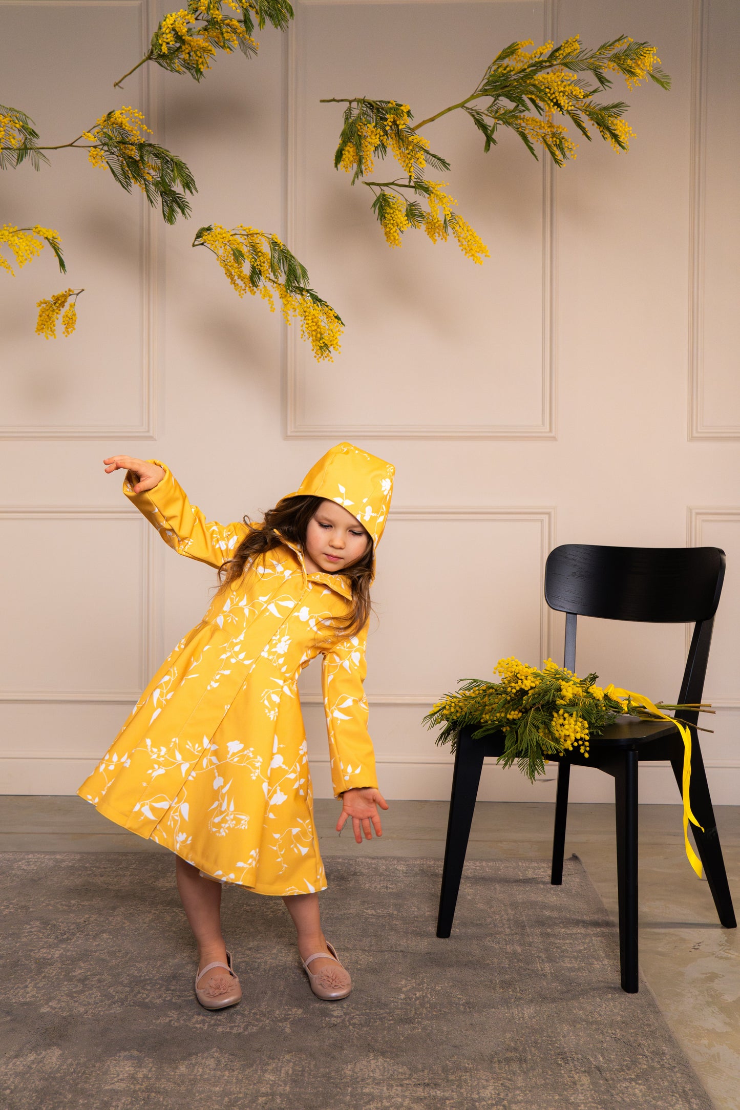 Wrap your little sunshine in the soft "Majestic Yellow" coat! This radiant water-resistant fitted and flared coat comes in a sunny yellow hue that'll brighten up any day. Adorned with a delicate white flower print, it adds a touch of playfulness to her wardrobe. Inside, the coat is lined with light pink satin for extra coziness. With its cheerful color and charming design, this coat is sure to bring smiles wherever she goes!