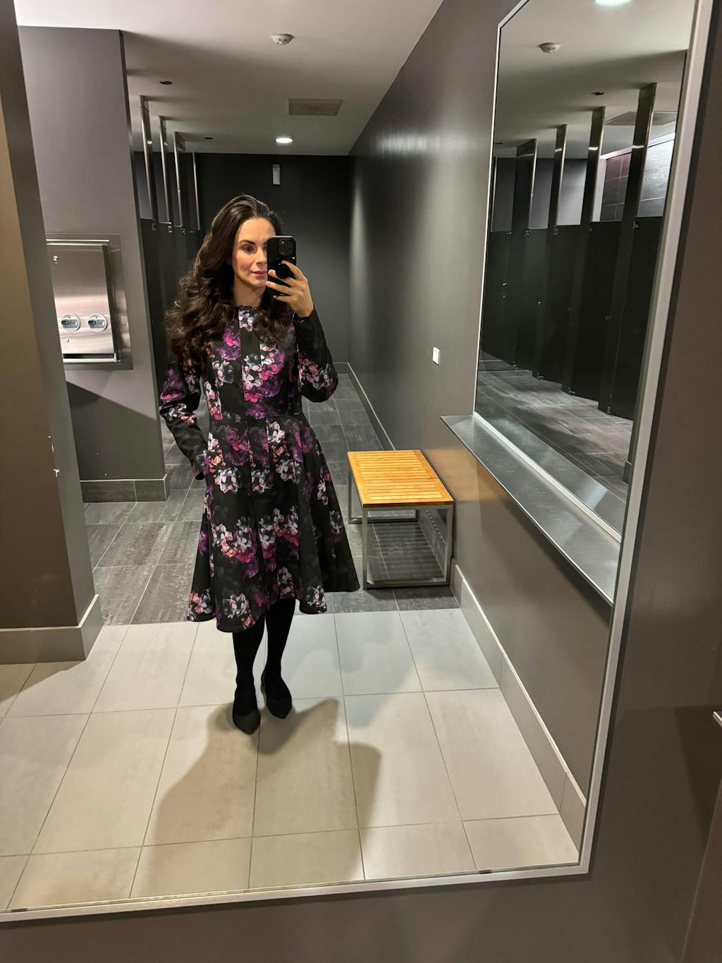 A women’s single-breasted floral fit-and-flare coat with vibrant purple and pink flower print, designed with a fitted bodice and flowing A-line skirt, finished with smooth black Italian satin lining and a matching tie belt for a chic, flattering silhouette.