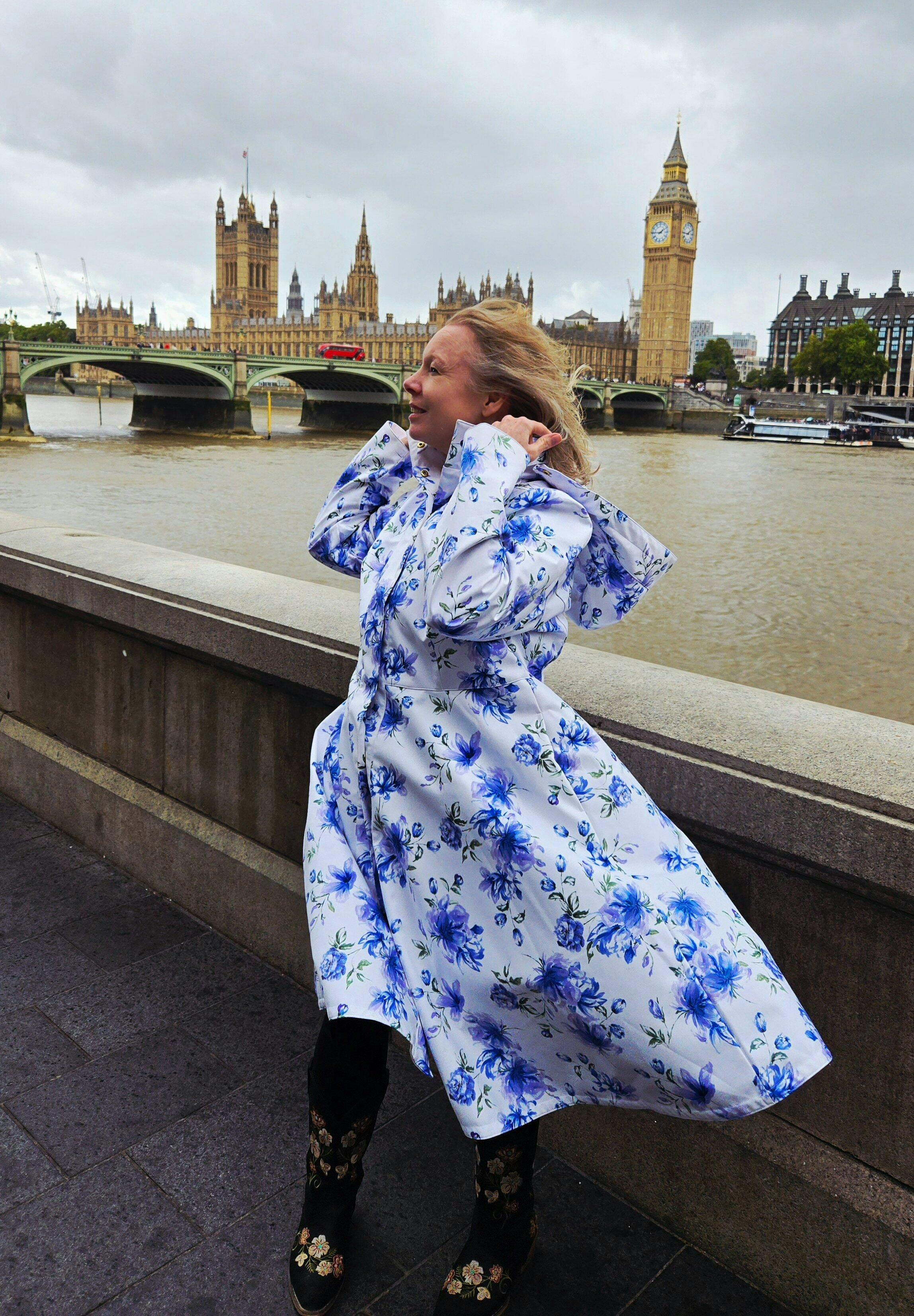 Discover elegance and style with our white trench coat, adorned with a delicate blueish flower print and green leaves. It has a fitted bodice and a flared a-line skirt. The luxurious white inner satin lining is made from fine Italian fabric. This coat is water-resistant and designed with a detachable hood, combining practicality with beauty and making it a perfect choice for a special occasion.