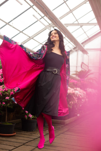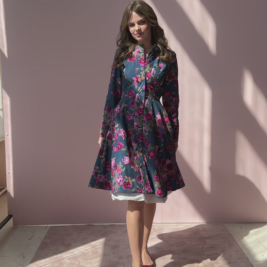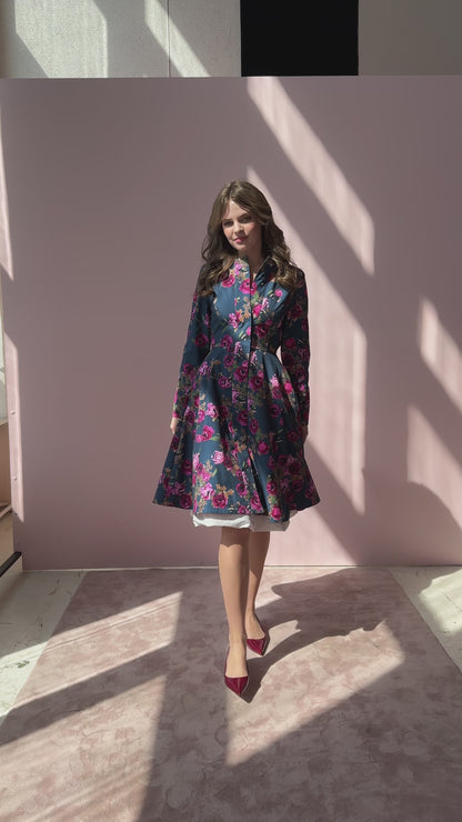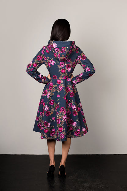Our “Misty Rose" - fitted and flared woman's coat with pleated back - is adorned with a delightful pink garden rose pattern on a teal blue background. Embrace the feminine allure with a form-fitted top, accentuated waistline, a full skirt with pleats at the back, and a voluminous hood. Revel in luxury with the high-quality Italian satin lining in a bright pink, making the "Misty Rose" coat a perfect blend of floral beauty, flattering design, and comfort.