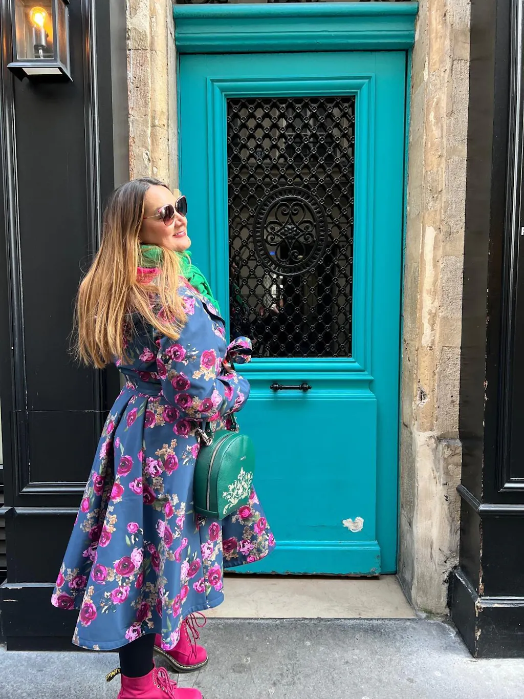 A women’s single-breasted floral fit-and-flare coat with a teal blue background and pink garden rose print. It has a form-fitted bodice, accentuated waist, and full skirt with back pleats, finished with bright pink Italian satin lining and a matching tie belt for a beautifully feminine silhouette.