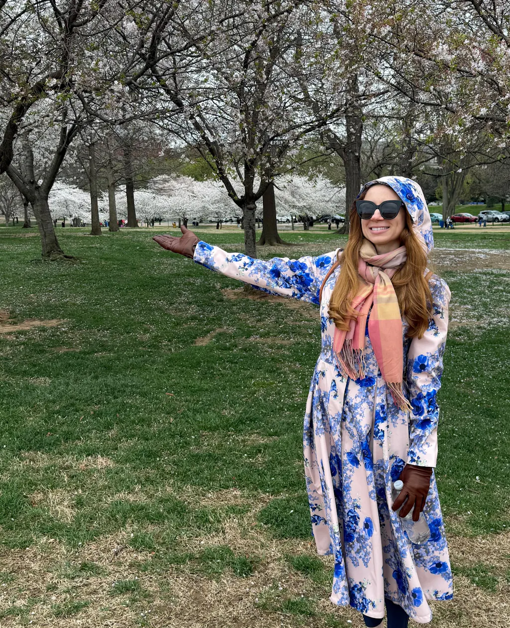 A women’s beige floral fit-and-flare coat with a delicate blue flower print. It has a form-fitted bodice and a flared skirt with bold front and back pleats. The coat is lined with smooth beige Italian satin for a graceful, feminine silhouette.