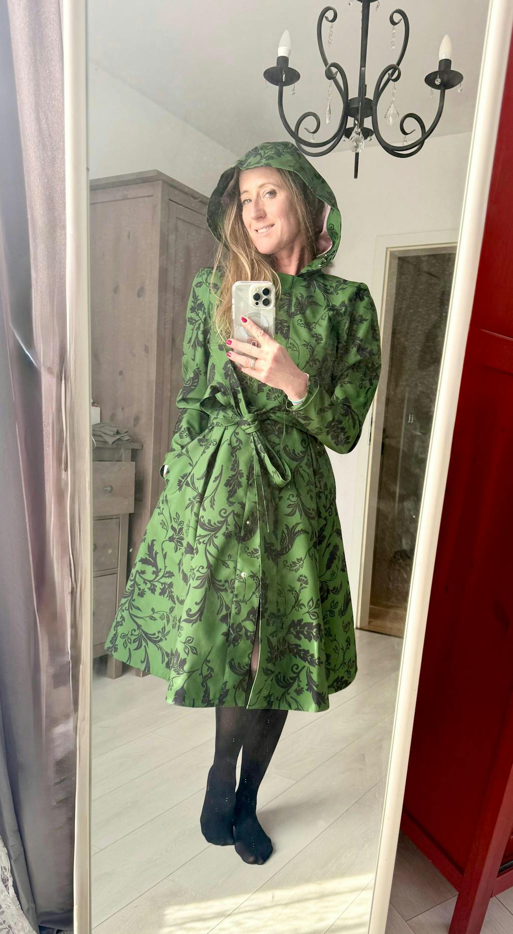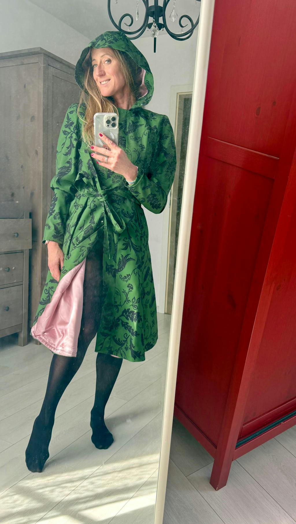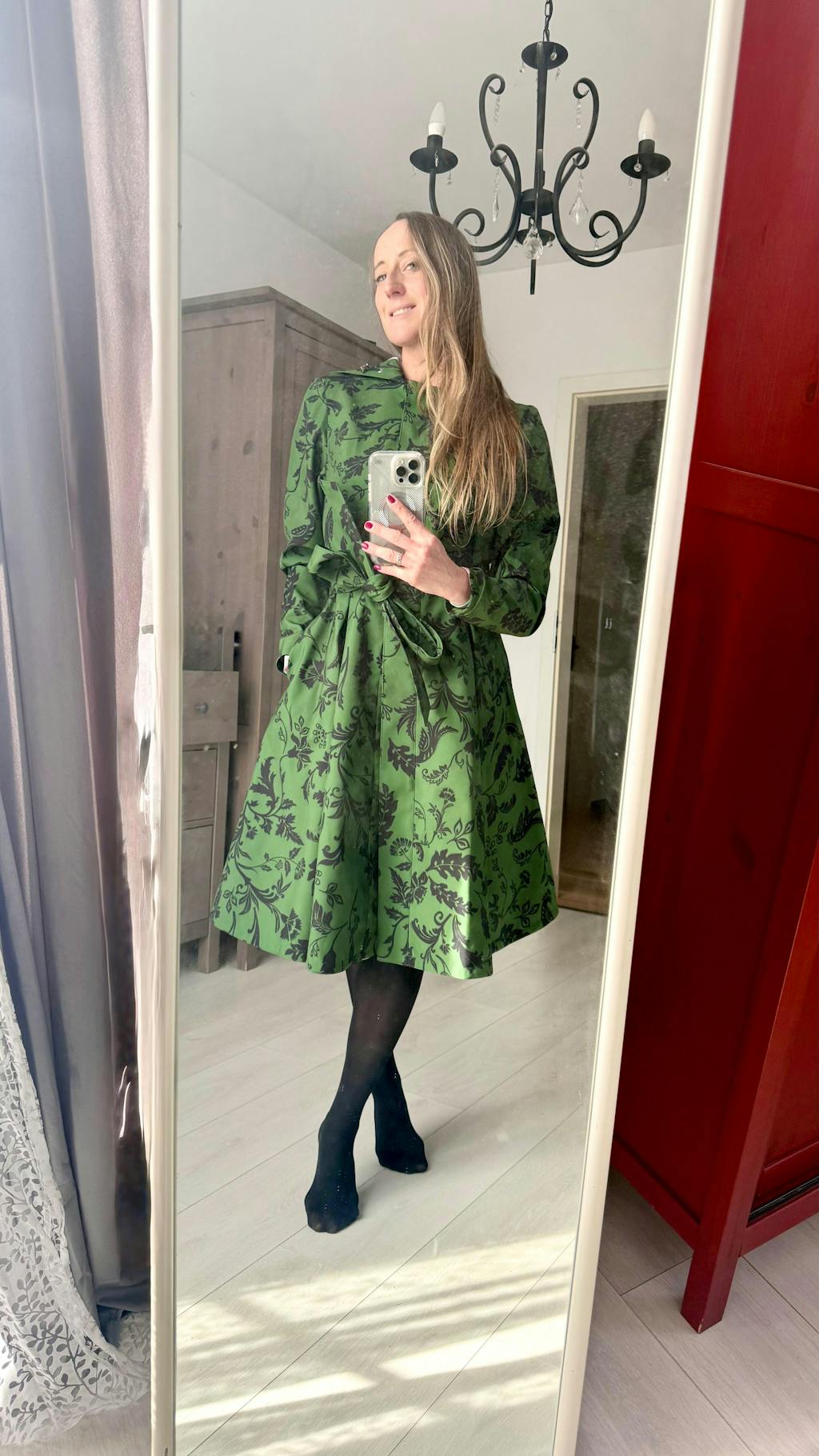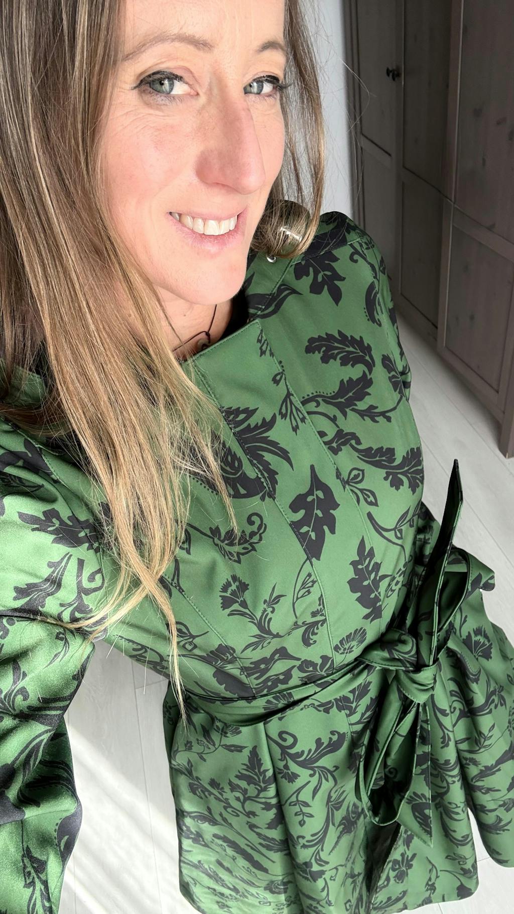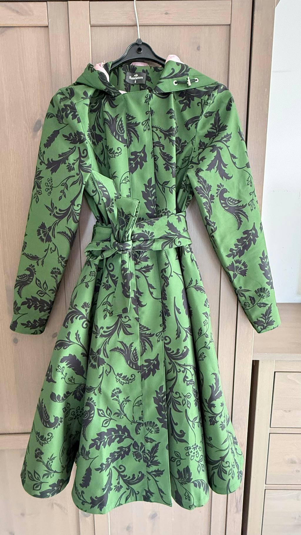 A women’s single-breasted dark green floral fit-and-flare coat with a fitted bodice and flared skirt featuring front and back pleats, finished with soft pink Italian satin lining and a matching tie belt for a chic, feminine silhouette inspired by nature.