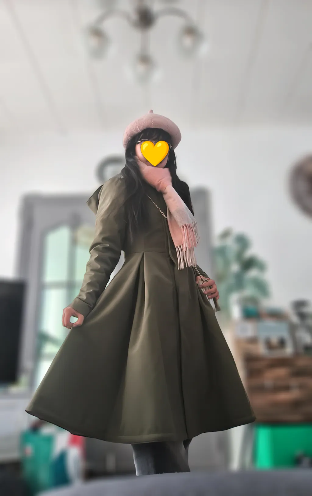 A women’s single-breasted moss green fit-and-flare coat with a fitted bodice and flared pleated skirt featuring statement front and back pleats, finished with luxurious ashy pink Italian satin lining and a matching tie belt for an elegant, flattering silhouette.
