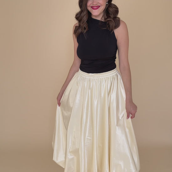 Our Off-White Balloon Midi Skirt is designed to move with you and flatter every shape. Along with its hidden ribbon inside the waistband that lets you adjust the fit, the skirt also features discreet in-seam pockets—practical yet completely invisible, keeping the silhouette smooth and refined.